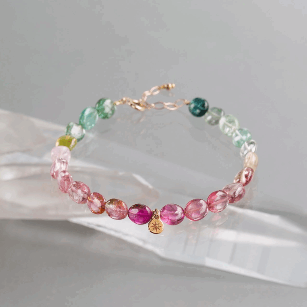 ブラジル産マルチトルマリンを使用した、ブレスレットのご紹介です。ピンク、ブルー、グリーン——それぞれの色がまるで光の糸のように美しく紡がれ、繊細なグラデーションを描くトルマリンたちは、キャンディーのように愛らしく、心弾むポップな彩りをまといます。ほんのり遊び心を添え、大人の女性の中にある柔らかさや自由さをさりげなく引き出しながら、手元を優しく彩るブレスレットに仕立てられています。多彩な色を持つトルマリンは、総じて繊細かつ優れた浄化作用を備えており、身につけることで心のざわめきや不要な思考が静かに洗い流されていくような感覚をもたらします。グリーンは物事に動じない穏やかな強さを授け、 ブルーは芸術的な感性や澄んだまなざしを引き出し、 ピンクは満たされた愛と微笑みの波動を伝えてくれます。色とりどりの個性が調和するマルチトルマリンならではの魅力を、ぜひお楽しみください。
